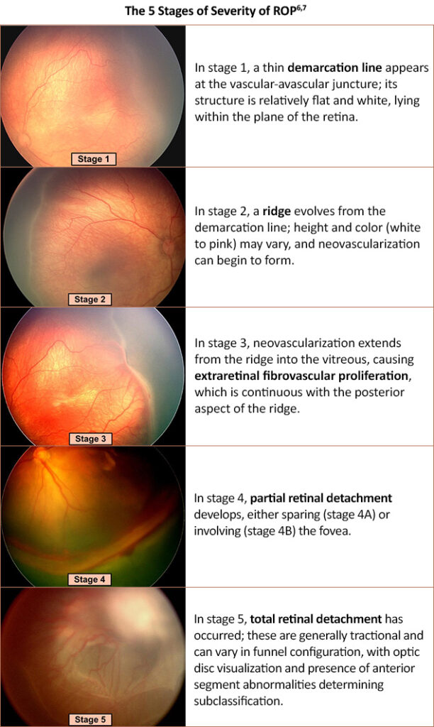 There are five stages of severity of ROP. Higher numbered stages represent more severe disease and threat to vision than lower numbered stages.5